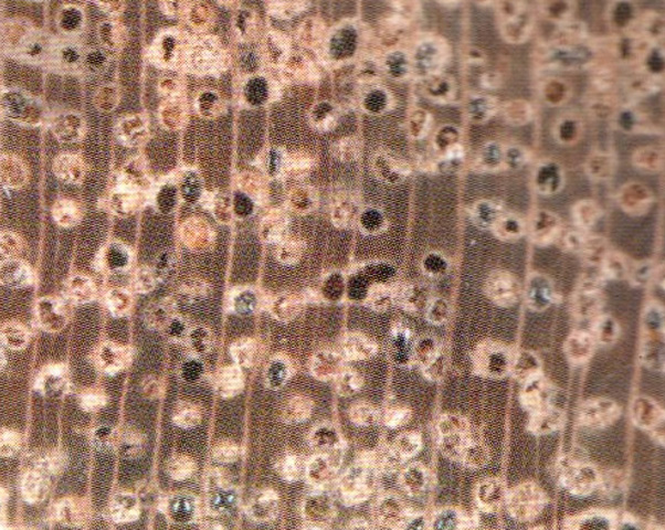 散孔材。管孔肉眼下可見(jiàn),略少,大小中等;主為單管孔,極少短徑列復(fù)管孔(2~3個(gè));部分略斜列;多褐色樹(shù)膠。軸向薄壁組織放大鏡下可見(jiàn),環(huán)管束狀、近翼狀及聚翼狀。木射線放大鏡下明顯,略密,略寬。軸向樹(shù)膠道肉眼下明顯,白色點(diǎn)狀,單獨(dú)或短弦列。