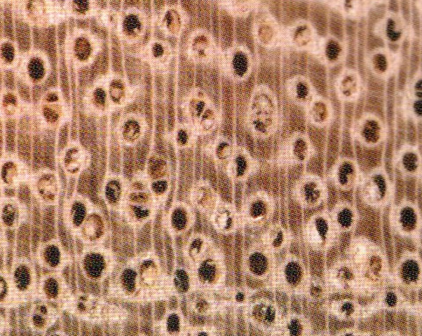 散孔材。管孔肉眼下明顯少而略大;主為單管孔,少數(shù)徑列復(fù)管孔(2~3個(gè));含淺色臘質(zhì)沉積物和褐色樹膠。軸向薄壁組織肉眼下可見,發(fā)達(dá),環(huán)管狀、翼狀,聚翼狀及輪界狀。木射線放大鏡下明顯,密度中。窄。