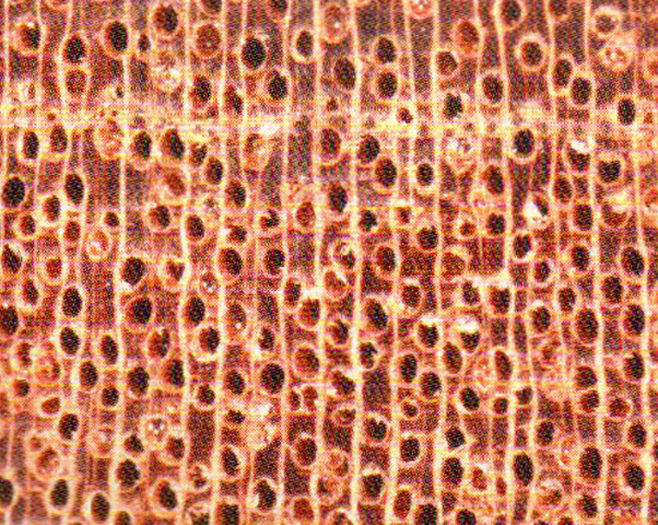 散禮材。管孔肉眼下明顯,略多,大小中等;單管孔;部分斜列;侵填體豐富,軸向蒲壁組織放大鏡下可見,環(huán)管束狀或近翼狀。本射線肉眼下略見。略密,略寬。軸向樹膠道內(nèi)眼下明顯,長弦列白色點(diǎn)狀。