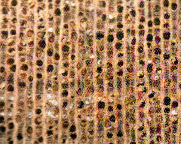 ●識(shí)別要點(diǎn):原木端面常見(jiàn)空洞和白色樹(shù)膠面。材表常殘留有麻絲狀內(nèi)皮。日曬后呈卷曲。管孔全部單管孔。白色點(diǎn)狀樹(shù)膠道明